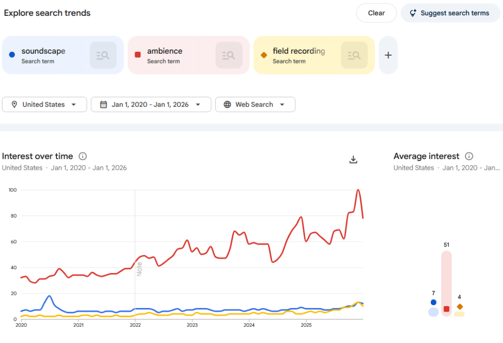 “Soundscape” surfaces heavily in academic, design, and planning contexts because it is the only term with a formal definition. ISO standardization gave it legitimacy in fields that have to describe environments in a serious way. Architects, urbanists, and researchers need a term that points to perception and measurement. “Ambience” is too casual for that and “field recording” points to the wrong part of the workflow. Of the three soundscape, from my brief searches, is the most likely to be listed in a job posting.